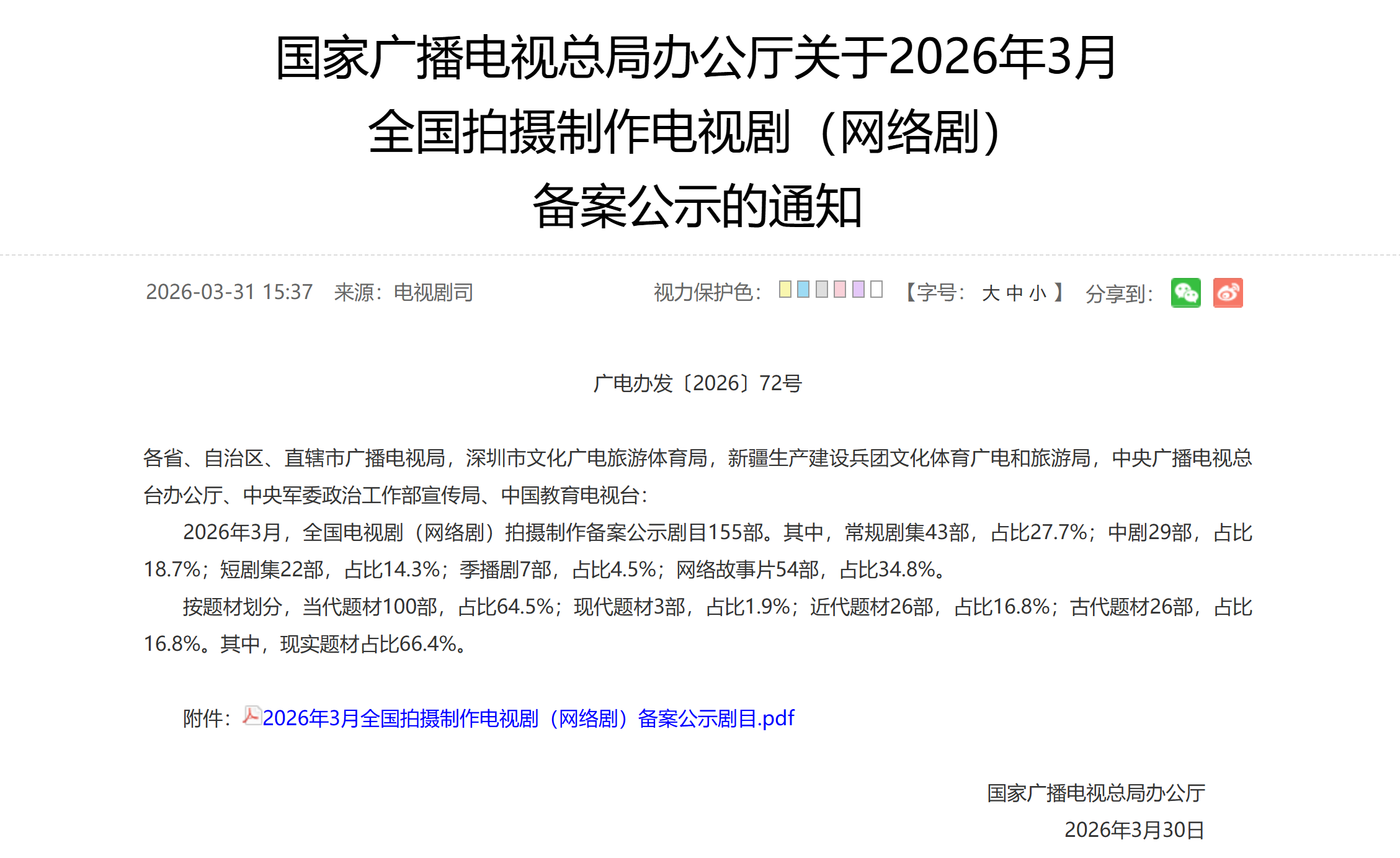 4月2日,记者从国家广播电视总局官网获悉,《2026年3月全国电视剧(网络剧)拍摄制作备案公示》已正式发布。
