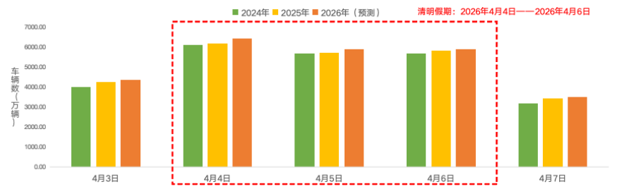 预计清明假期,全国高速公路日均总流量约为6100万辆,较2025年同期增长3.0%左右,流量峰值出现在假期第一天,预计6450万辆。