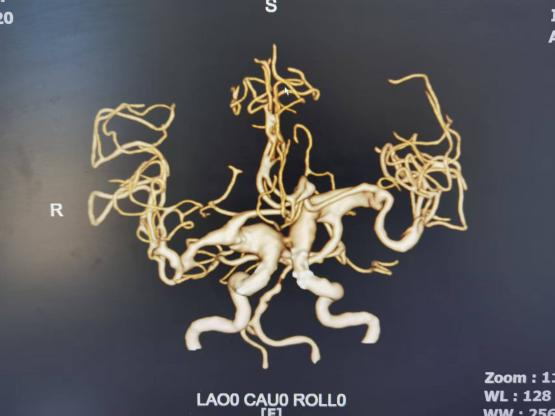 一位因反复头痛就诊的患者,经CT血管成像检查,确诊为颅内巨大动脉瘤,形态不规则,破裂风险极高。面对这一急危重症,孔令超与当地医生共同分析病情,制定诊疗方案。