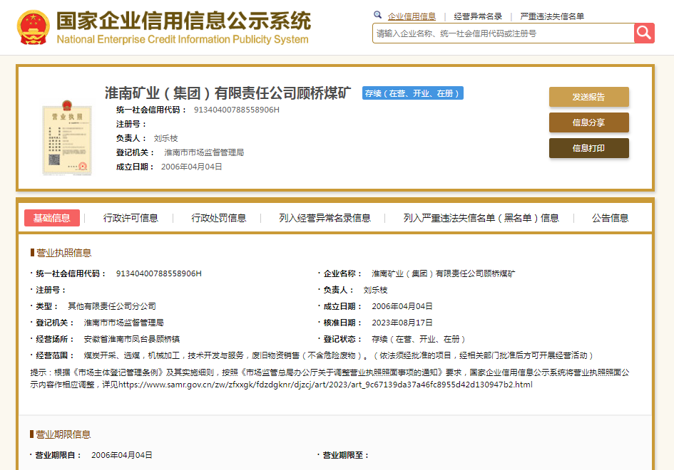 国家企业信用信息公示系统显示,淮南矿业(集团)有限责任公司顾桥煤矿成立于2006年,负责人刘乐枝。其母公司——淮南矿业(集团)有限责任公司则成立于1981年,注册资本1810254.9111万元人民币,法定代表人韩家章,大股东为淮河能源控股集团有限责任公司。
