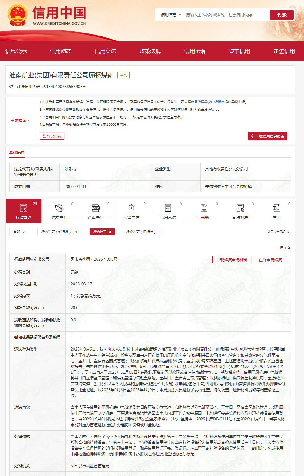 齐鲁晚报·齐鲁壹点记者于信用中国行政处罚公示栏获悉,3月17日,淮南矿业(集团)有限责任公司顾桥煤矿(下称“淮南矿业顾桥煤矿”)因“未能对压力管道进行检验并办理特种设备使用登记证”等,收到20万元罚单,处罚机关为凤台县市场监督管理局。