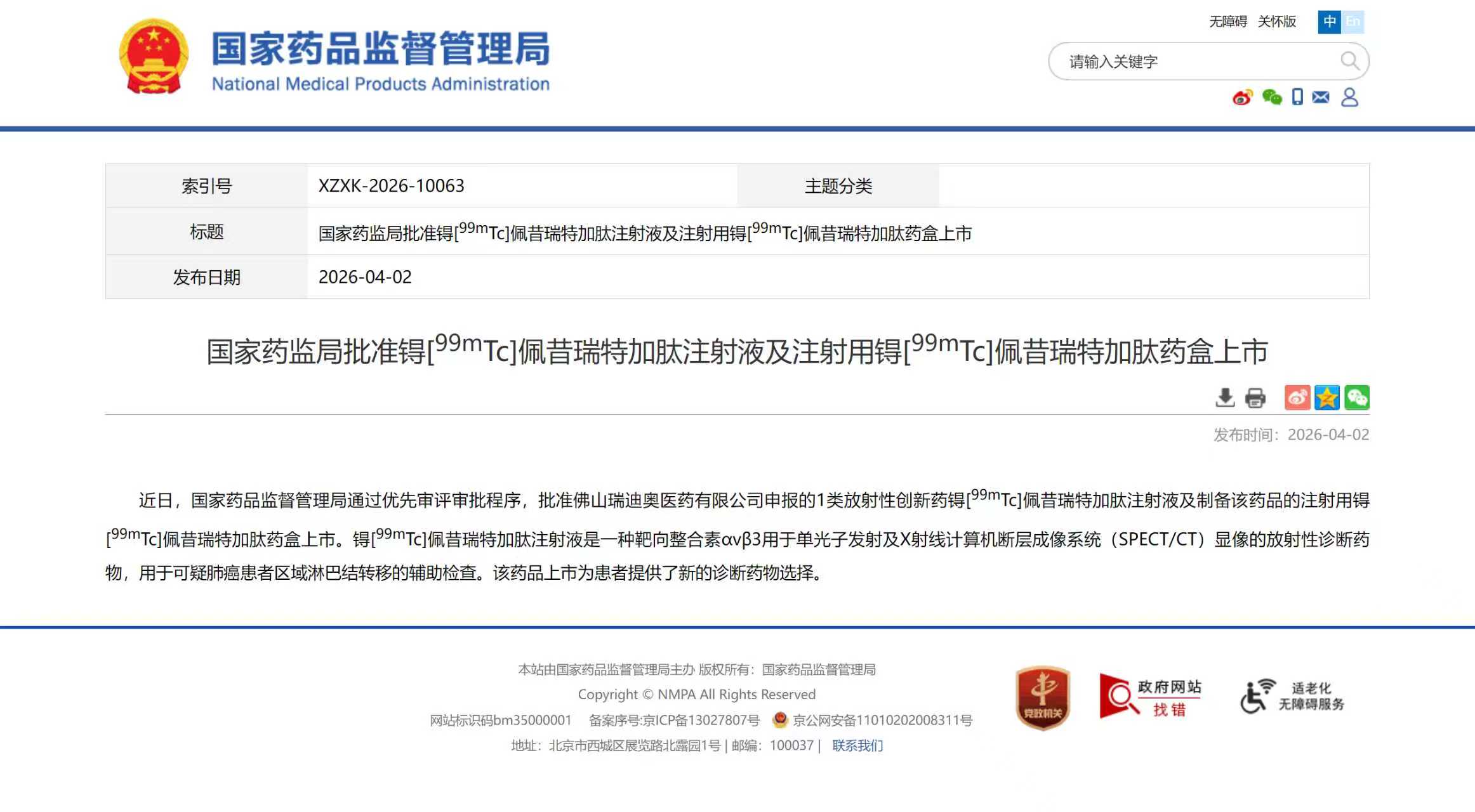 半岛网4月2日讯 (记者 孙贴静)2026年4月2日,百洋医药集团投资孵化的核医学创新企业——佛山瑞迪奥医药有限公司(北京吉伦泰医药有限公司控股子公司)申报的1类创新核药锝99mTc佩昔瑞特加肽注射液(99mTc-3PRGD2,商品名:吉伦泰)及制备该药品的注射用锝99mTc佩昔瑞特加肽药盒正式获得国家药品监督管理局(NMPA)批准上市。作为中国首个自主研发的1类创新核药、全球首个用于SPECT显像的广谱肿瘤显像剂。99mTc-3PRGD2的获批不仅标志着中国核医学药物自主研发从0到1的重大突破,更是从“跟跑”向“原创领跑”的重大跨越。