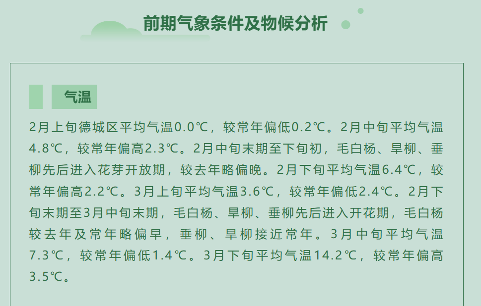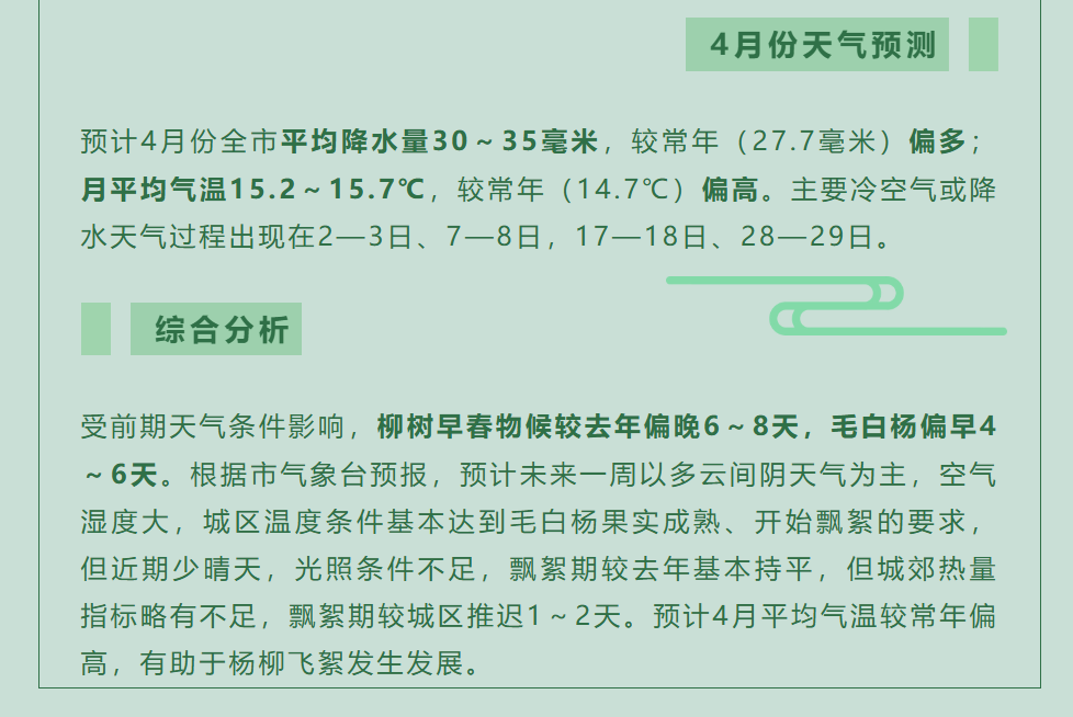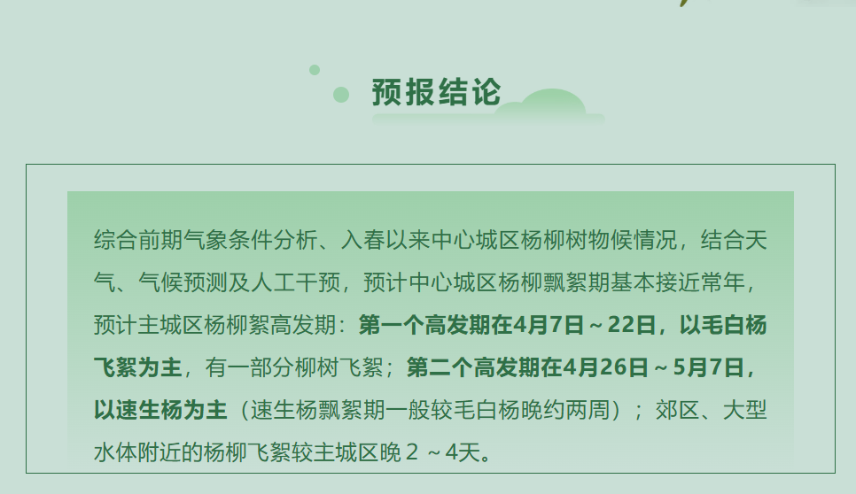 易过敏人群请注意。4月2日下午,德州市气象台发布“德州市中心城区杨柳飘絮期预报”,预计主城区杨柳絮高发期:第一个高发期在4月7日—22日,以毛白杨飞絮为主,有一部分柳树飞絮;第二个高发期在4月26日—5月7日,以速生杨为主(速生杨飘絮期一般较毛白杨晚约两周);郊区、大型水体附近的杨柳飞絮较主城区晚2~4天。(大众新闻记者徐付彪)