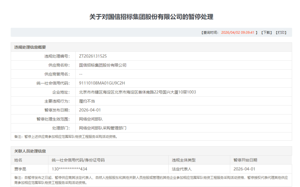 根据《关于对国信招标集团股份有限公司的暂停处理》信息显示,违规处理编号:ZT2026131525,供应商名称:国信招标集团股份有限公司,统一社会信用代码:91110108MA01GU9C2H,企业地址:北京市市辖区海淀区北京市海淀区首体南路22号国兴大厦10层1003,主要违规行为:履约不当,暂停处理生效范围:网络空间部队,处理部门:网络空间部队采购管理部门,暂停发布日期:2026-04-01。