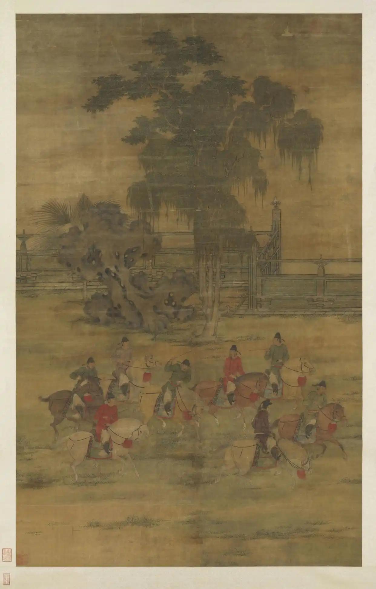 《八达春游图》是五代后梁画家赵嵒的传世名作,此画现藏于台北故宫博物院。赵嵒喜绘画,尤工人物,格韵超绝。善画人马,俊挺有气格,但流传至后世的画作甚少。《八达春游图》的画面以八位头戴官帽、身着红紫官服之人纵马游春为主线,将清明时节的生机与闲适融为一体。画面中,垂柳依依,草木新绿,一块灵石点缀其间,与八匹神骏矫健的马匹形成动静对比。画家以细劲的线条勾勒人物与马匹,马匹错落有致,或轻步,或嘶鸣,或低头,姿态各异,仿佛能听见马蹄踏过草地的轻响。八位骑马者或顾盼召唤,或挥鞭督行,衣冠端庄却神情轻松。这幅画不仅是对春日游宴的记录,更是五代时期文化与自然审美交融的见证。