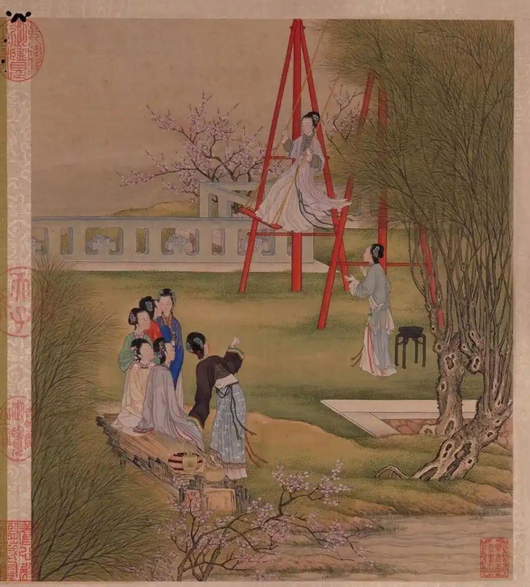如果说《八达春游图》展现的是男子的豪迈,那么清代画家陈枚的《月曼清游图》册页中的“杨柳荡千”一开,则描绘了宫廷女子在清明时节的婉约之趣,此画现藏于北京故宫博物院。陈枚早年与兄陈桐赴京师研习宋元名迹,雍正至乾隆年间参与宫廷集体创作其《月曼清游图册》采用西洋透视法,描绘宫廷女子四季生活。“杨柳荡千”的画面中,杨柳新绿,红杏初绽,仕女身着修长轻盈的衣衫,在秋千架上身姿轻盈,仿佛与春风共舞。秋千架下,其他仕女或围观欢笑,或推搡助力,整个画面充满了欢快活泼的气息。陈枚以工细流畅的线条与亮丽鲜活的色彩,既承袭了宋代院体画的严谨,又融入了明代唐寅、仇英的秀逸,更以西洋焦点透视法增强了画面的立体感,使宫廷的春日欢歌跃然纸上。