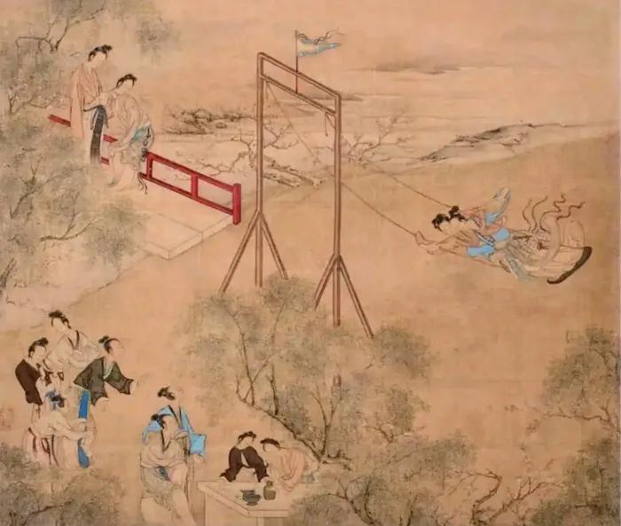 同样是描绘荡秋千的场景,清代宫廷画家冷枚的《荡秋千》则呈现出另一番热闹景象。冷枚是山东胶州人,擅长人物,兼通山水、花鸟,作品融合西洋透视技法与传统工笔,风格工整妍丽。《荡秋千》中仕女衣袖流线自然、色彩清新雅致,秋千之上两位女子裙袂翩翩,宛若仙女降临人间,充满了动感与活力。与陈枚的宫廷题材不同,冷枚的《荡秋千》更贴近市井生活,女子的笑容与姿态透露出清明时节民众的放松与喜悦。冷枚作为融合中西技法的宫廷画家,其笔下的秋千之戏既保留了传统仕女画的柔美,又通过色彩与构图的创新,赋予画面更强的现实感,成为清代清明题材绘画中的一抹亮色。