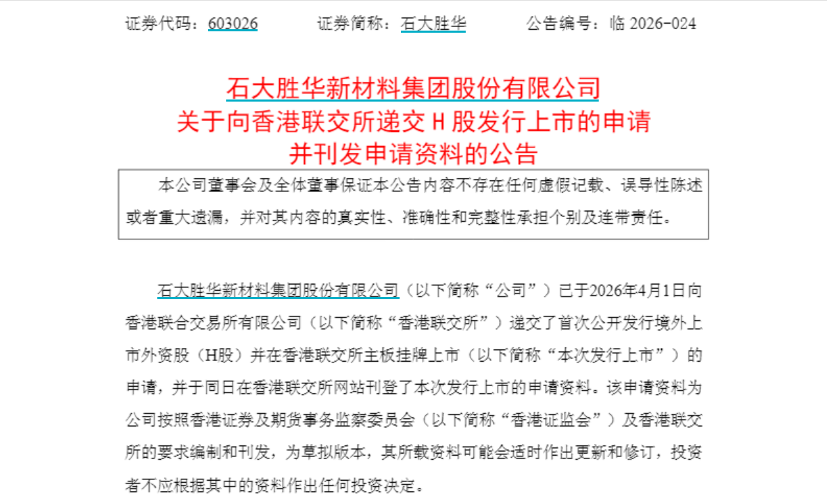 4月1日晚,石大胜华(603026.SH)公告称,公司已于当日递表港交所,拟在香港联交所主板挂牌上市,中金公司为其独家保荐人。
