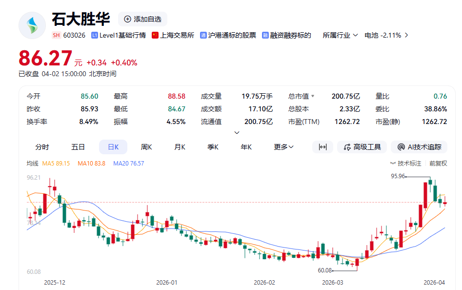 股价方面,截至4月2日收盘,石大胜华上涨0.4%,报收于86.27元/股,全天换手率8.49%,成交量19.75万手。