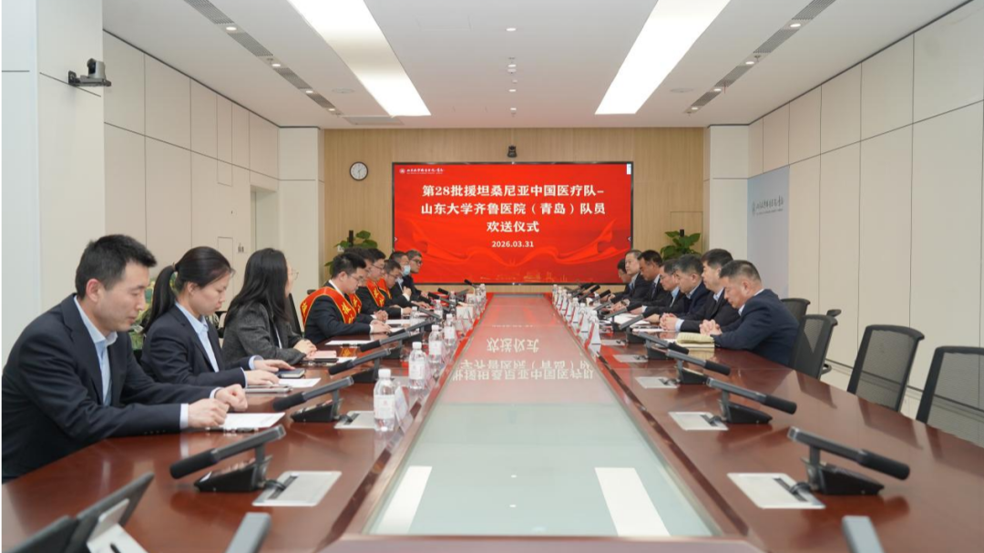 半岛网4月2日讯(记者 张家瑞)2026年3月31日下午,山东大学齐鲁医院(青岛)隆重举行第28批援坦桑尼亚中国医疗队队员欢送仪式,欢送脊柱外科周超、神经外科和政、手足与显微重建外科曾卫、心外科杜永海四位同志跨越万里赴坦桑尼亚执行援外医疗任务。党委书记苏华、院长高海东及全体院领导班子成员出席会议,副院长杨中军主持仪式,相关临床科室及职能部门负责人参加。