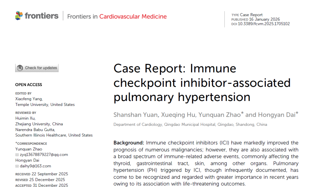 近日,青岛市市立医院保健三科主任戴红艳带领肺动脉高压团队成功诊断并救治一例由抗肿瘤药物免疫检查点抑制剂(PD-1抑制剂)引发的重度肺动脉高压患者,为肿瘤免疫治疗相关罕见不良反应的识别与处理提供了宝贵的临床经验,为肿瘤患者的安全治疗敲响了警钟。