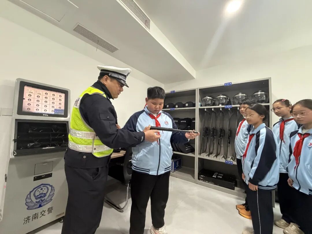 在警用装备展示环节,民警精心展示了执法单警装备、酒精测试仪、防爆盾等各类警用装备和交通工具,逐一讲解装备的用途、使用方法及在交通管理工作中发挥的作用。孩子们目不转睛地观看,踊跃举手提问,民警耐心细致地解答每一个问题,还邀请孩子们近距离触摸、体验警用装备,现场气氛热烈又欢快。通过直观的展示与讲解,孩子们真切地感受到了公安交管工作的专业性与严谨性,也对交警日常执勤的辛苦有了更深的体会。