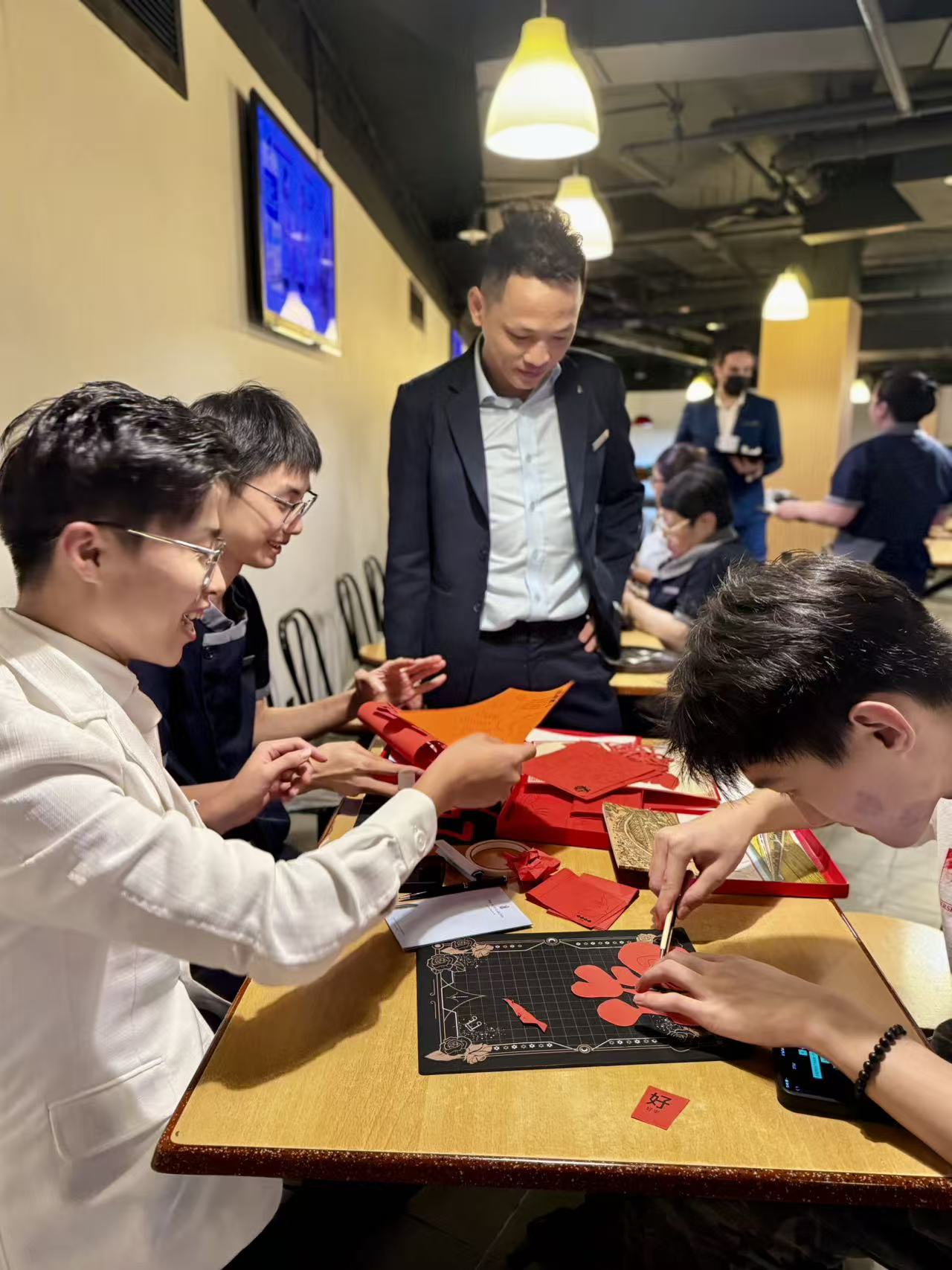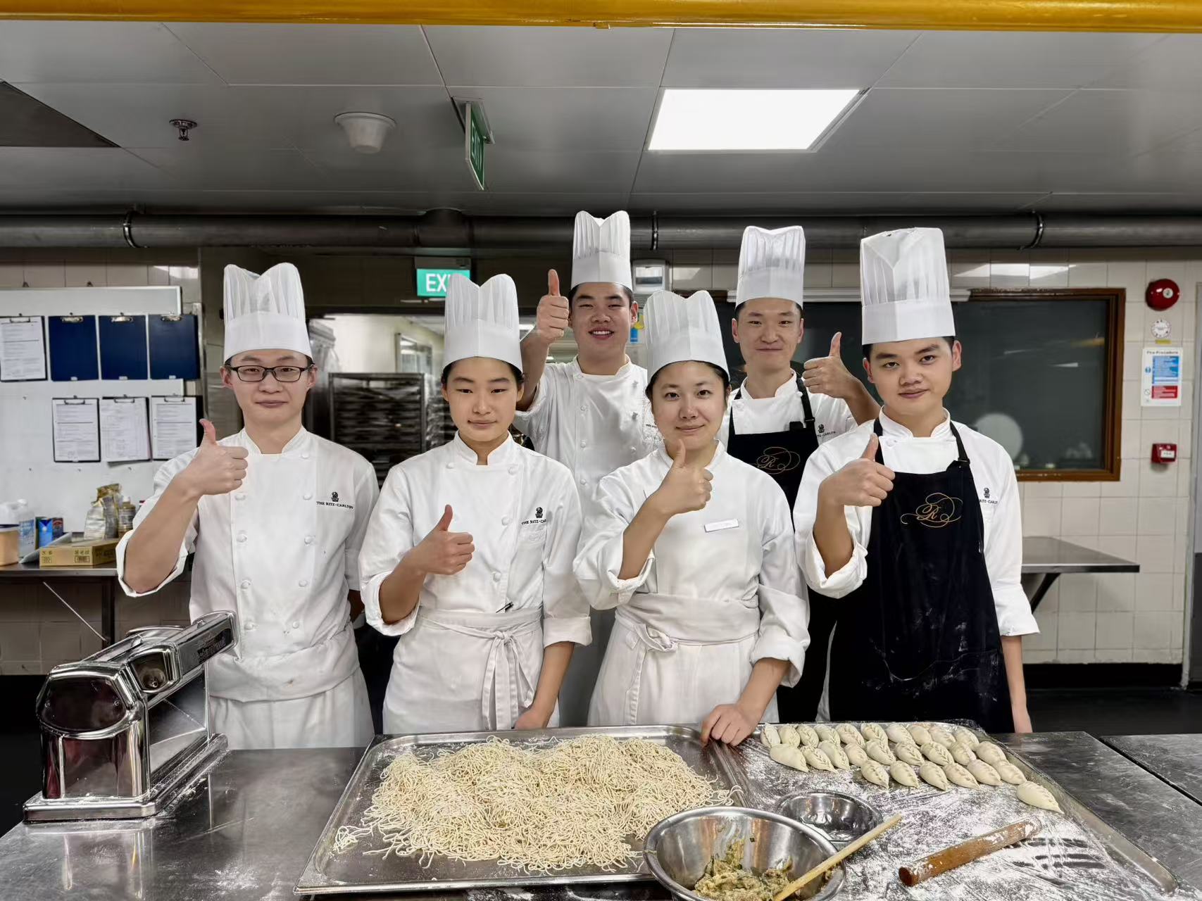 本次活动创新设置静态展示、动态演绎及互动体验三大展区,多角度、全方位呈现齐鲁非遗文化的独特魅力。静态展示区,非遗文化体验空间古韵盎然,葫芦十二生肖剪纸惟妙惟肖,掐丝珐琅京剧脸谱色彩绚丽,宋锦珍珠扇华美别致,一件件代表性非遗作品集中亮相,让现场宾客沉浸式领略齐鲁大地的文化底蕴。动态演绎区,学子们现场制作泉城大包、老济南打卤面、清油盘丝饼、油旋等特色美食,鲜香的馅料裹入精巧面皮,筋道的面条淋上浓郁卤汁,一道道风味独特的齐鲁小吃,让宾客大快朵颐、赞不绝口。这是继前期首批赴新学子在北烁学校向学生传授小笼包制作工艺之后,又一场兼具技艺传承与风味展示的特色美食活动。互动体验区,学子们化身文化传播使者,手把手教给宾客剪福字,耐心解答他们的疑问,将“好客山东”的热情与真诚传递给在场的每一位友人。精美的非遗作品与深厚的文化底蕴,赢得现场一致赞誉,成为中新文化交流的生动注脚。