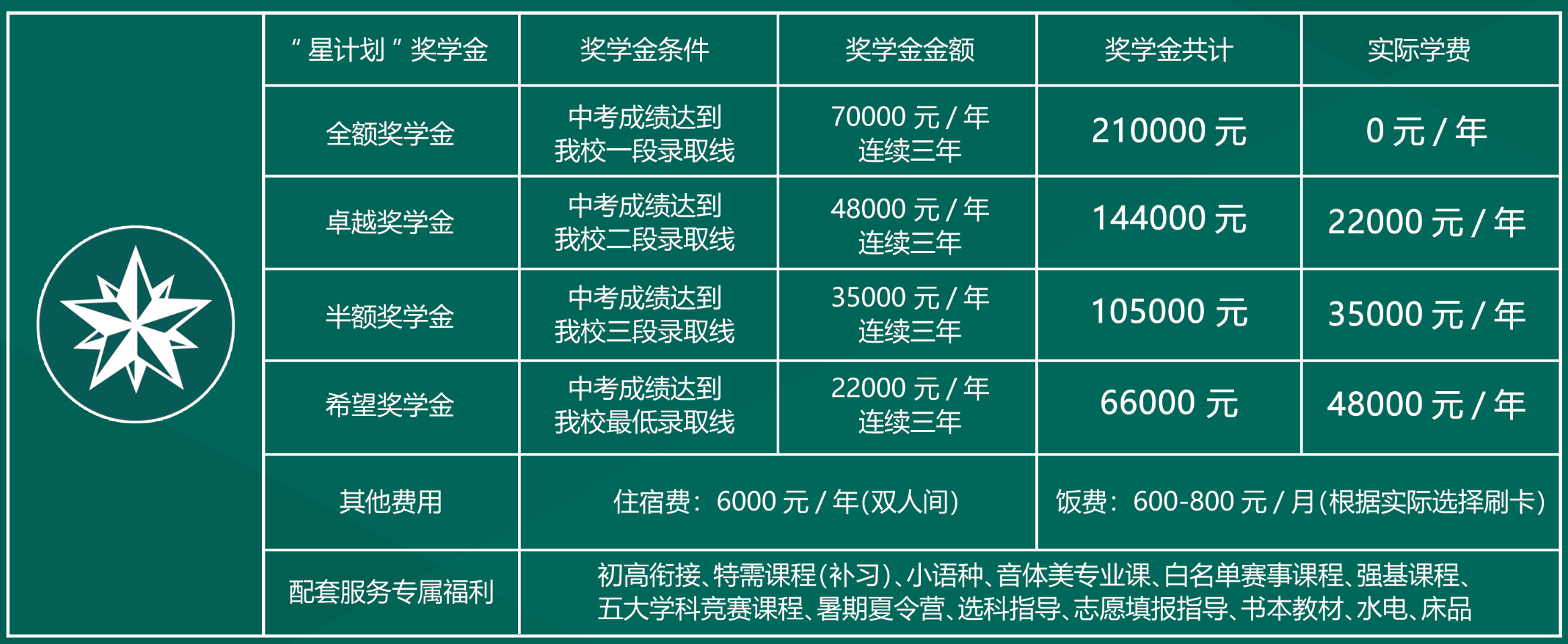 设立“星计划”多档奖学金,按中考成绩划定录取线,奖学金连续发放三年,覆盖学费不同减免梯度,成绩优异者可享三年学费全免。