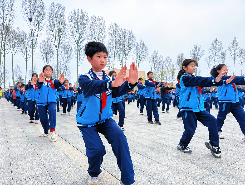 ▲寿光市文家街道西城小学将五步拳、少年拳一套、长拳一段融入大课间,打造特色武术课堂。孩子们在整齐划一的出拳、踢腿中舒展筋骨,增强力量与协调性,在日复一日的练习中强健体魄、磨炼意志。