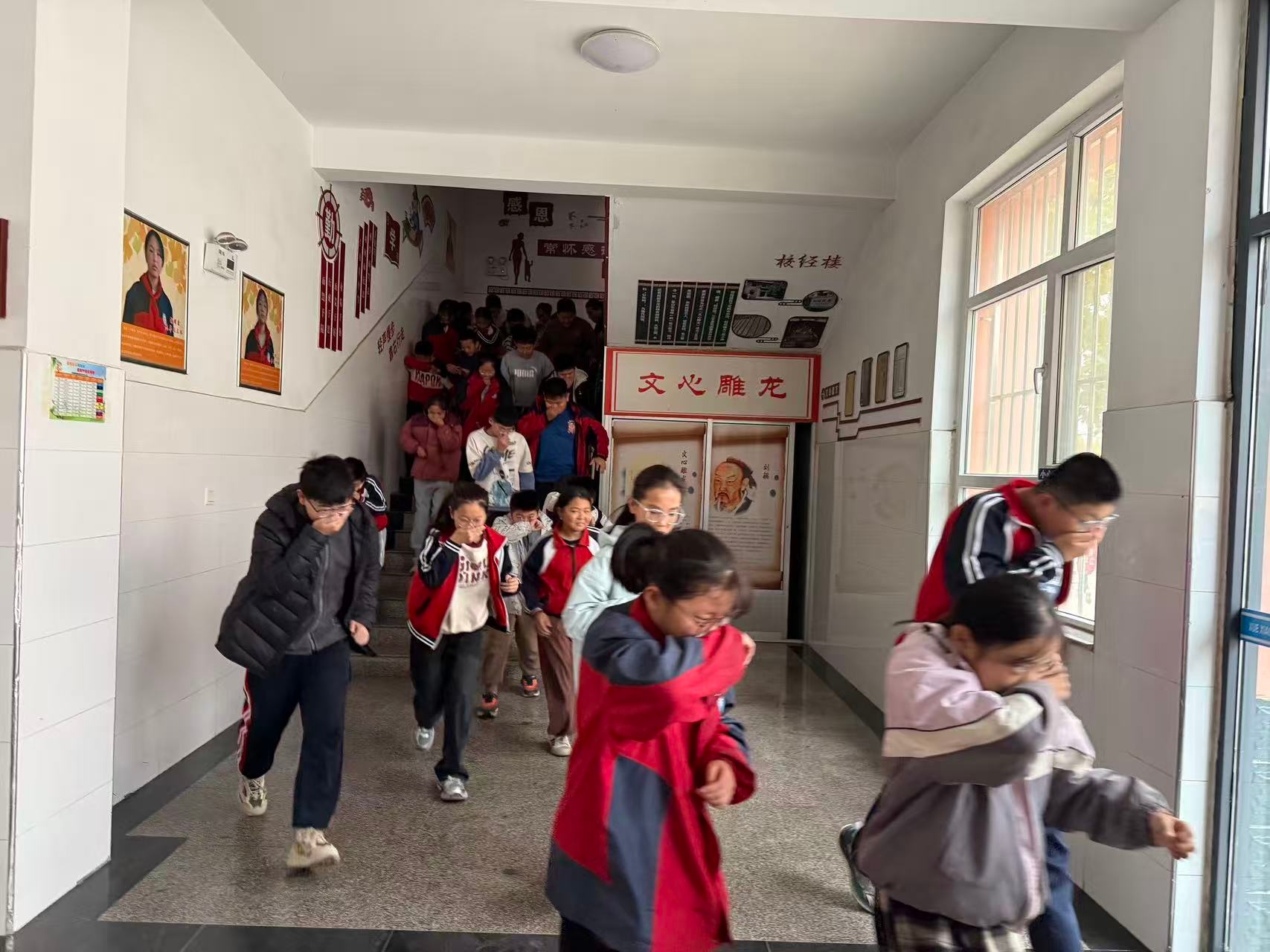 上午9:50,随着应急疏散警报响起,全校师生按照既定的“消防应急疏散演练预案”进行演练活动。同学们在老师的指导下,用手护住头和胸,就近或蹲或躲在课桌下。当警报再次响起时,班主任及科任教师组织学生弯着腰、用双手护着头,沿着学校指定路线快速前进,快速撤离教学楼,安全到达学校安全地带。