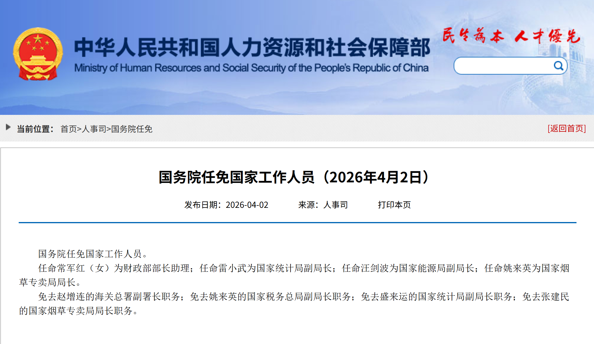 人社部网站4月2日消息,国务院任免国家工作人员。任命常军红(女)为财政部部长助理;任命雷小武为国家统计局副局长;任命汪剑波为国家能源局副局长;任命姚来英为国家烟草专卖局局长。免去赵增连的海关总署副署长职务;免去姚来英的国家税务总局副局长职务;免去盛来运的国家统计局副局长职务;免去张建民的国家烟草专卖局局长职务。