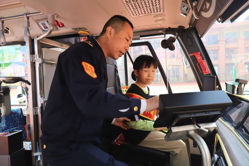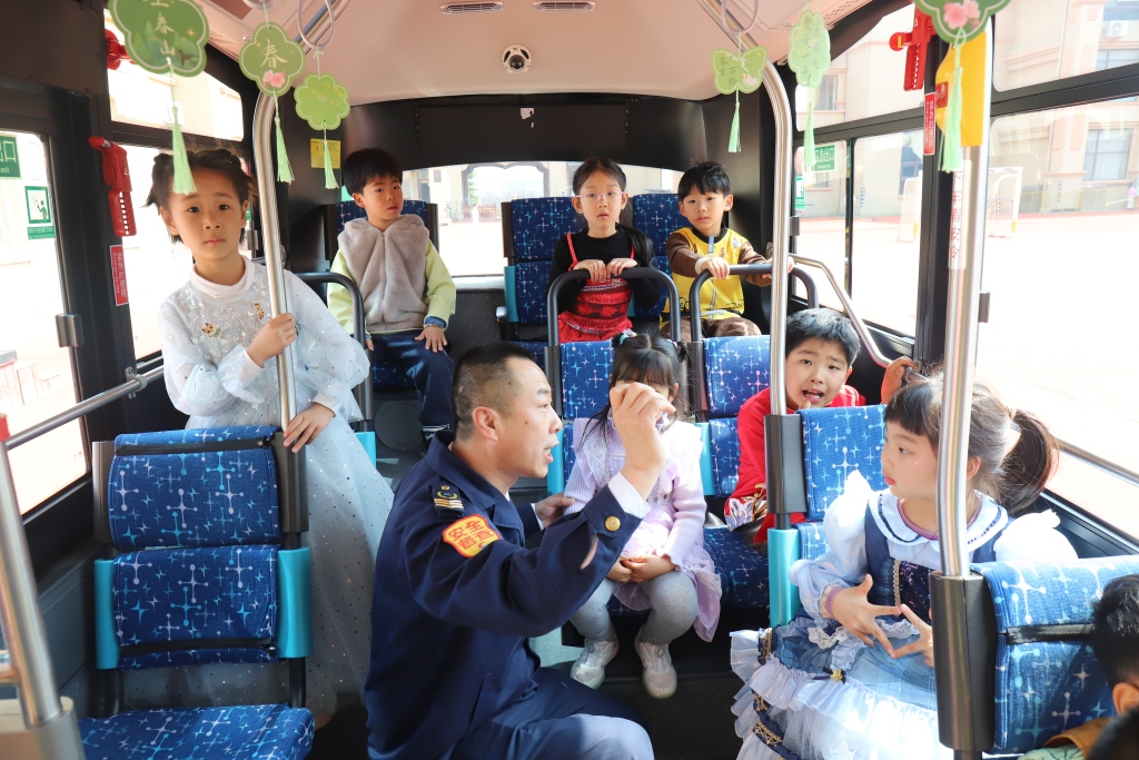 与此同时,为了让孙灏宣和同学们更深入地了解公交运营背后的故事,近距离感受“宝宝巴士”的魅力,青岛公交集团劳动模范、389路线驾驶员田言海还将一辆“宝宝巴士”开进了校园。这辆仅有6米长的小型公交车刚驶入操场,便瞬间成为校园里的焦点。在学生们有序登车后,田言海开始为大家讲解车内设施,从驾驶室到车厢安全设备,从新能源公交车的环保特性到日常安全运营的细节,一一娓娓道来。他还结合自己多年的驾驶经验,用生动易懂的语言向孩子们普及公交出行安全知识。