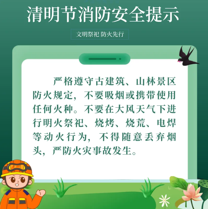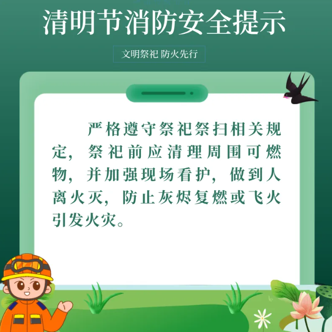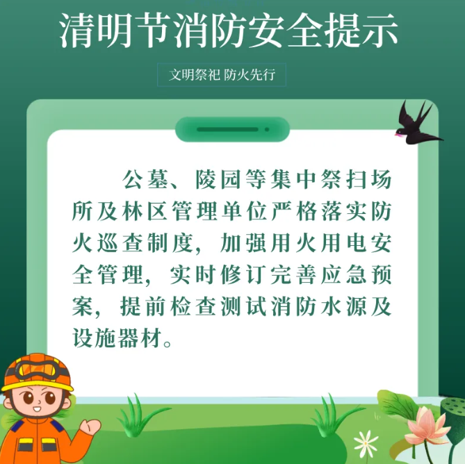 海报|文明祭扫 安全同行 东营消防发布安全提示大众新闻 杨珣 2026-04-02 21:39:59原创清明节即将来临,扫墓祭祖和外出旅游等活动频繁,加之春季大风天气较多,火灾风险性随之增加。东营消防发布清明节消防安全提示,提醒广大市民文明祭祀、安全用火,勿忘消防安全。(大众新闻记者 杨珣 通讯员 孙子潼)责任编辑:杜美萱