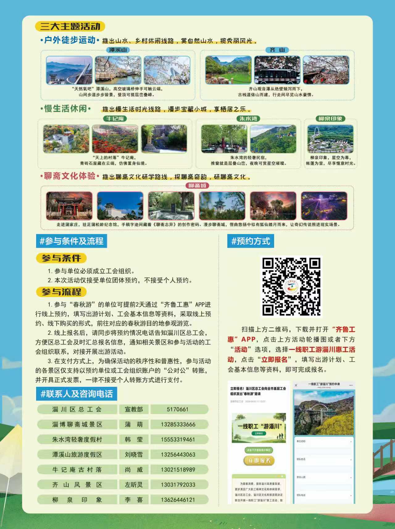 依托智慧工会平台,优化职工参与体验。利用互联网+普惠服务平台,依托“齐鲁工惠”APP开通一线职工“游淄川”活动专区,参与“春秋游”的单位可提前2天通过“齐鲁工惠”APP进行线上预约,填写出游计划、工会基本信息等资料,采取线上预约、线下购买的形式,前往对应的春秋游目的地参观游览。为确保活动的秩序性和普惠性,参与单位必须成立工会组织,此次活动也仅接受单位团体预约,不接受个人预约。