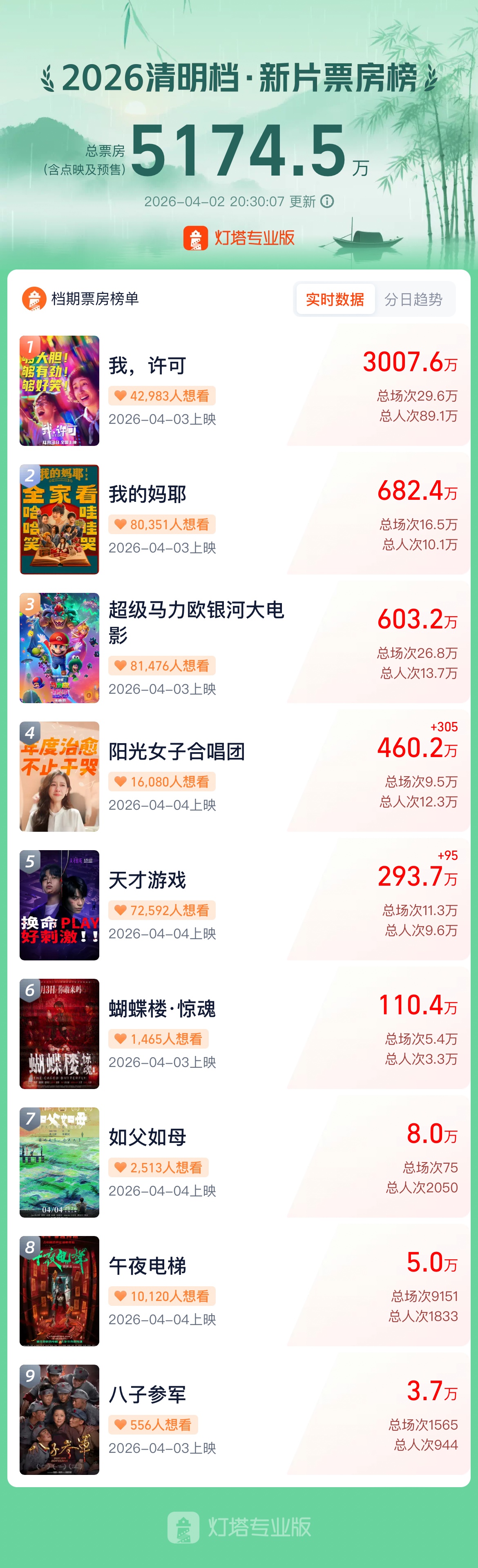据灯塔专业版数据,截至4月2日20时30分,2026年清明档新片预售总票房破5000万,《我,许可》《我的妈耶》《超级马力欧银河大电影》暂列预售票房榜前三位。 (大众新闻记者吕晗)