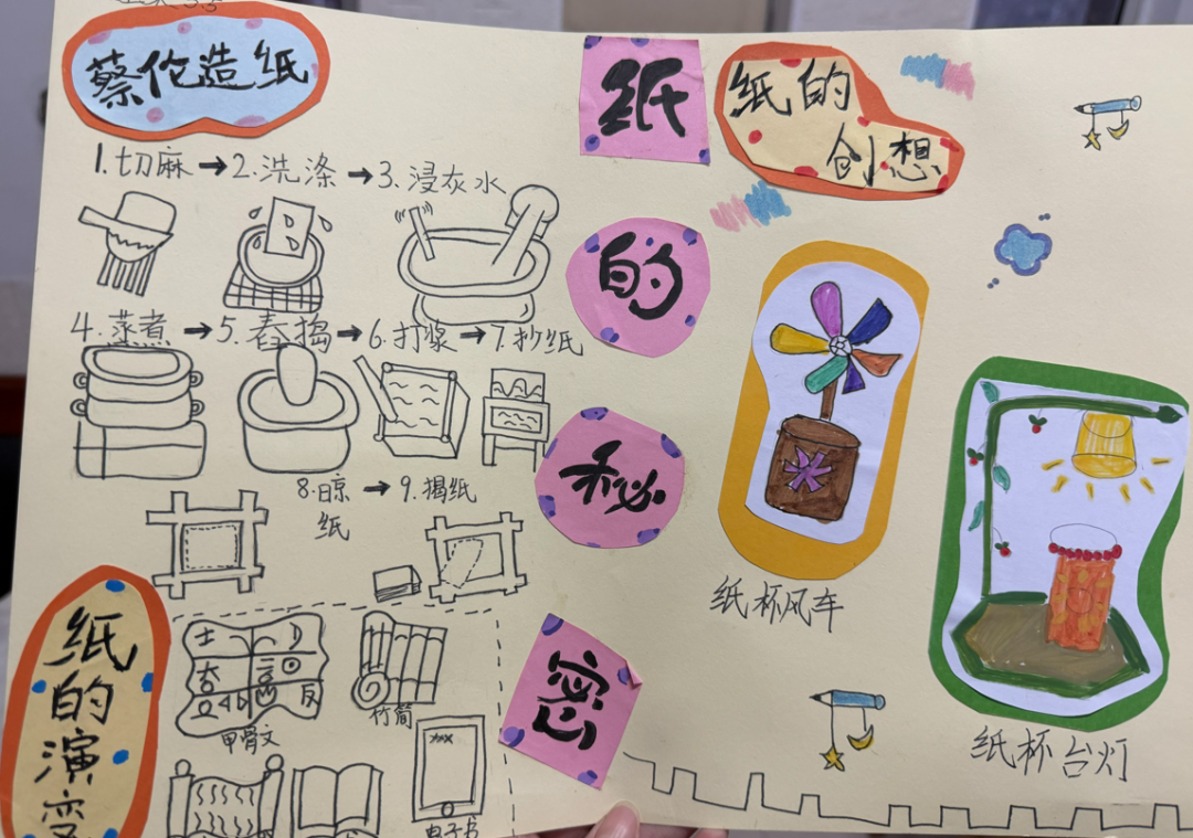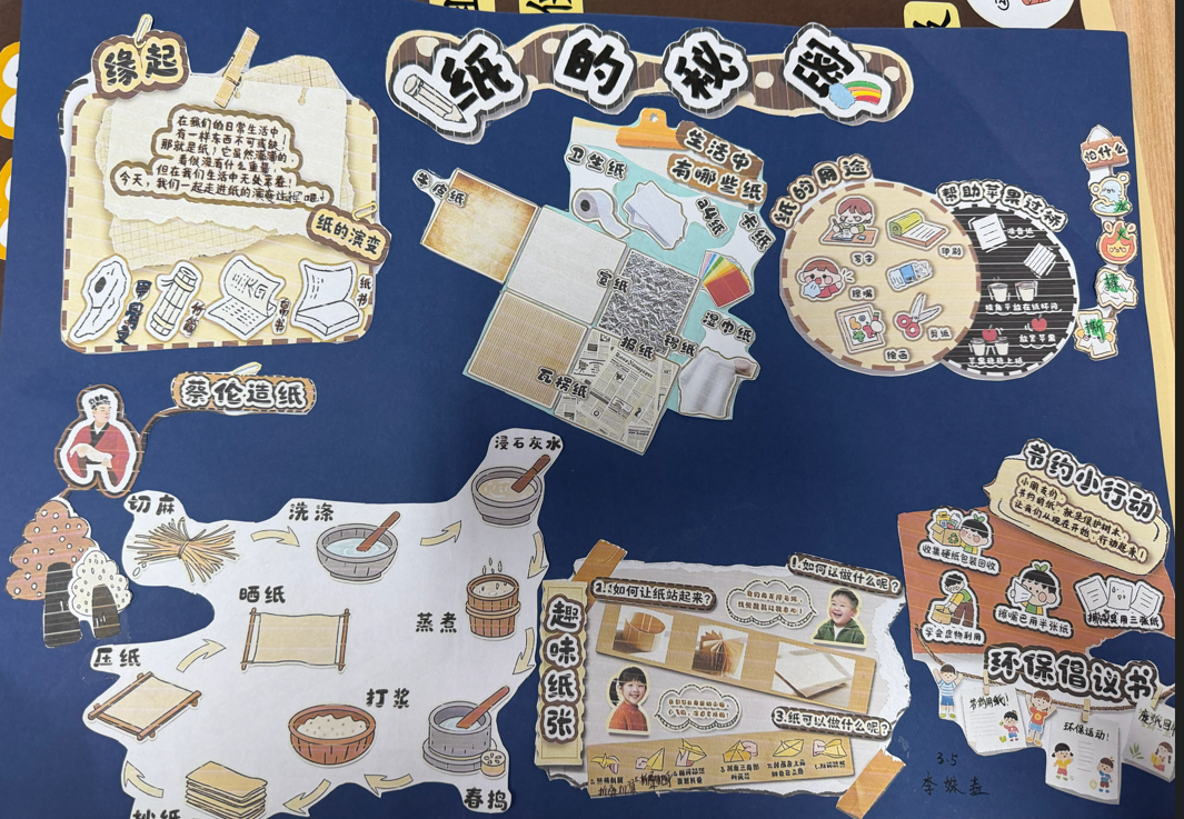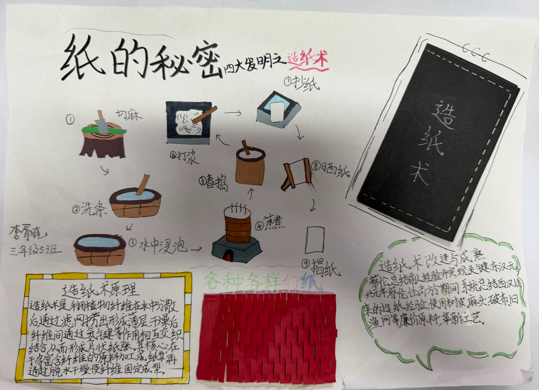 本次实践作业以四大闯关任务推进,引导学生走进纸的奇妙世界。活动中,化身“时光小侦探”的同学们,循着历史脉络探寻纸的起源与发展,用画笔勾勒《纸的秘密》画报,以多样呈现形式搭配简洁文字注解,生动展现纸的千年演变历程,彰显出探索热情与创意。