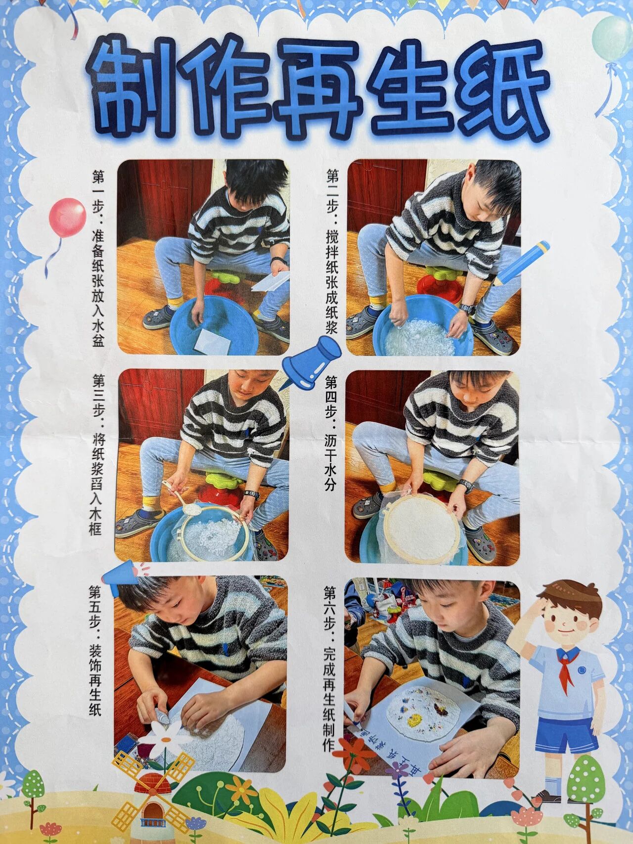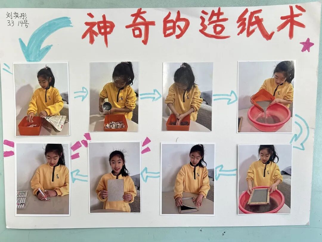 古法造纸体验环节亮点突出,同学们化身小小工匠,以废纸、滤网等简易材料为基础,亲手复刻传统造纸工艺,还为自制再生纸绘制创意图案,用镜头定格造纸全过程。指尖劳作中,同学们既感受了古人的匠心智慧,也深刻领悟了环保再生、变废为宝的绿色理念。