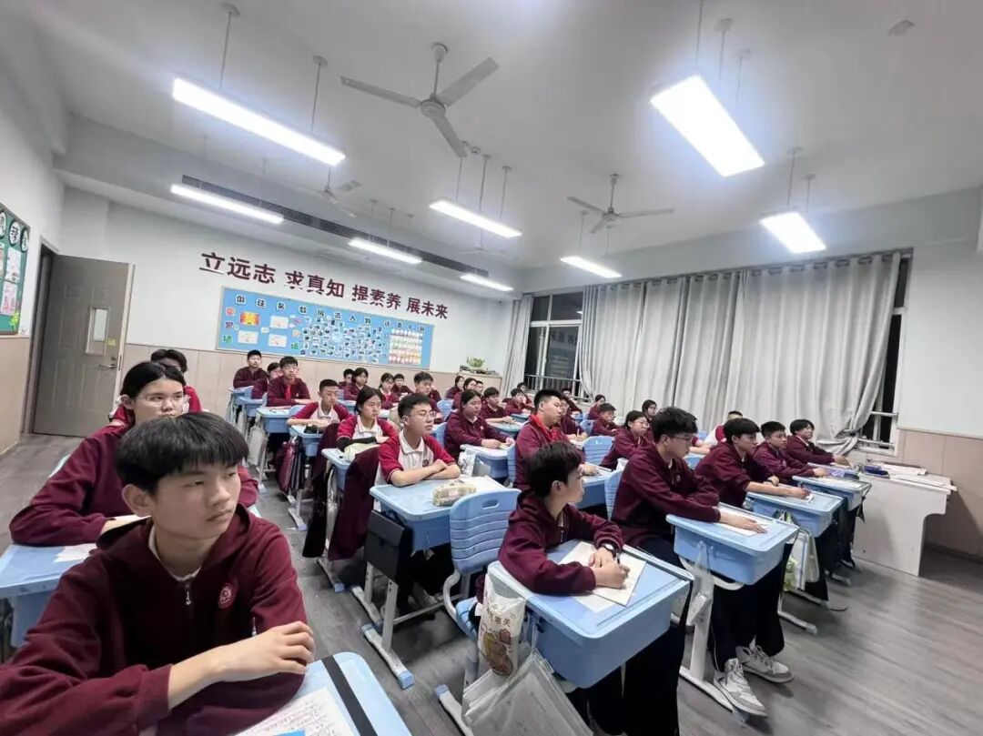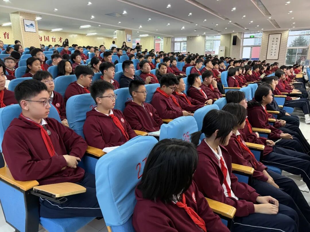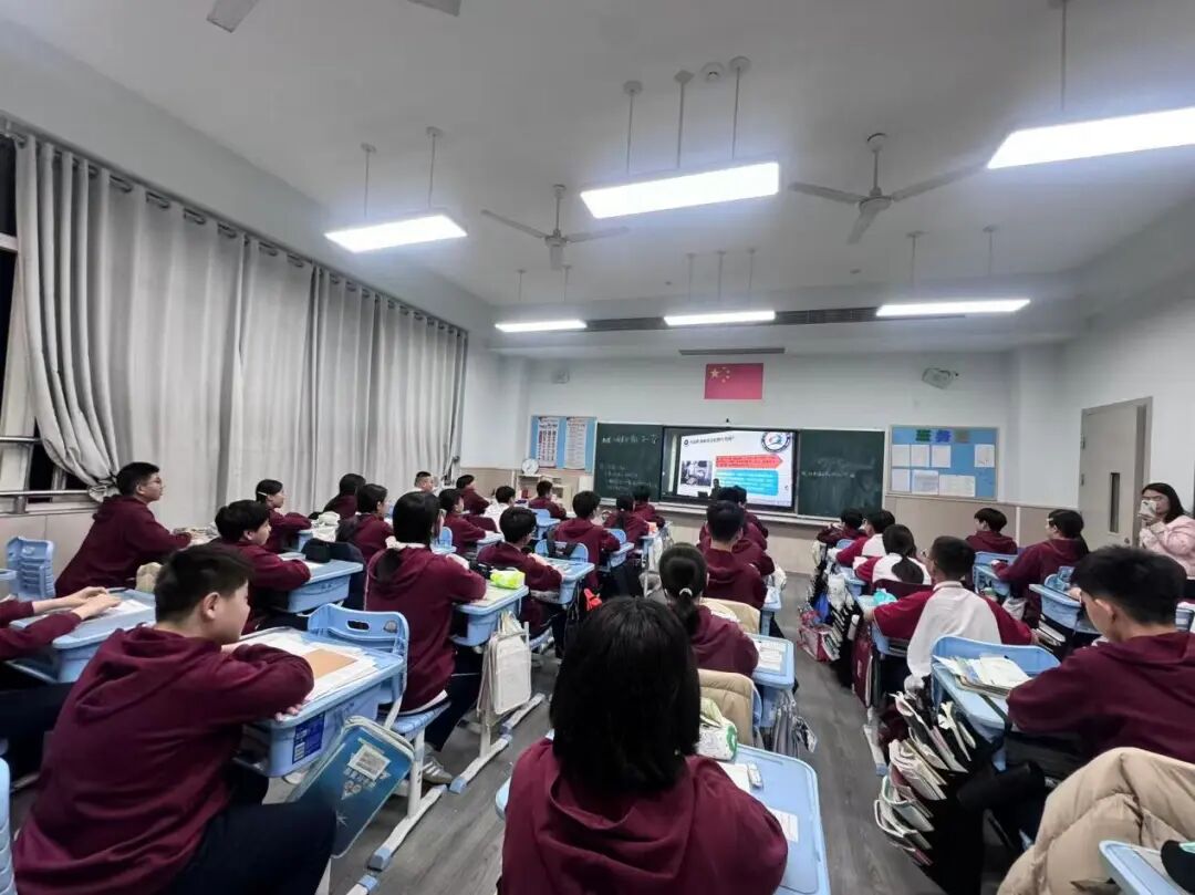 初一年级现场聆听报告,初二年级、高一年级通过学校直播在各班教室分会场观看报告。