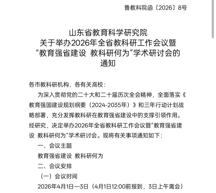 4月1日至3日,2026年山东省教科研工作会议暨“教育强省建设 教科研何为”学术研讨会在济南隆重召开。本次会议由山东省教育科学研究院主办,聚焦教育强省建设,统筹部署教科研重点工作,开展学术研讨与成果交流。
