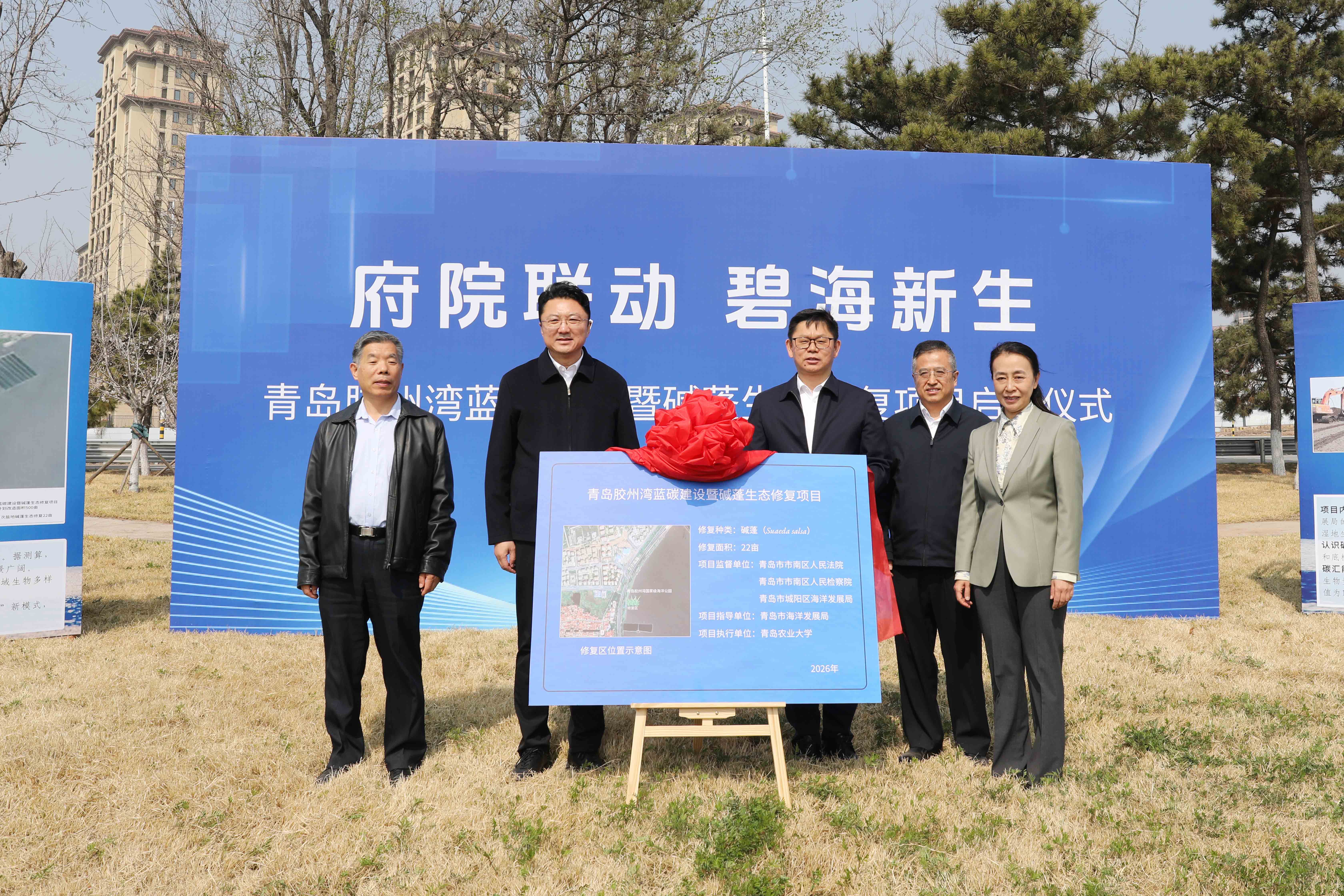启动仪式上,城阳区政府副区长王成君,市南区法院党组书记、院长肖政,市南区检察院党组书记、检察长于仲君,青岛市海洋发展局一级调研员王子江,青岛农业大学副校长孙庆杰,共同为“青岛胶州湾蓝碳建设暨碱蓬生态修复项目”揭牌。