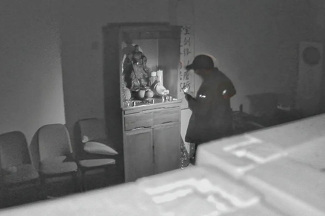 很快民警在当天凌晨一时左右的监控中发现了戴着鸭舌帽的嫌疑人,男子在二楼财神龛位前停留片刻,就迫不及待开始了翻箱倒柜地“求财”,民警顺着嫌疑人进出路线,结合划定的作案及可能踩点时间,不断扩大追踪范围,很快确定了嫌疑人马某,3月25日民警将返回暂住处准备收拾东西逃之夭夭的马某人赃并获。