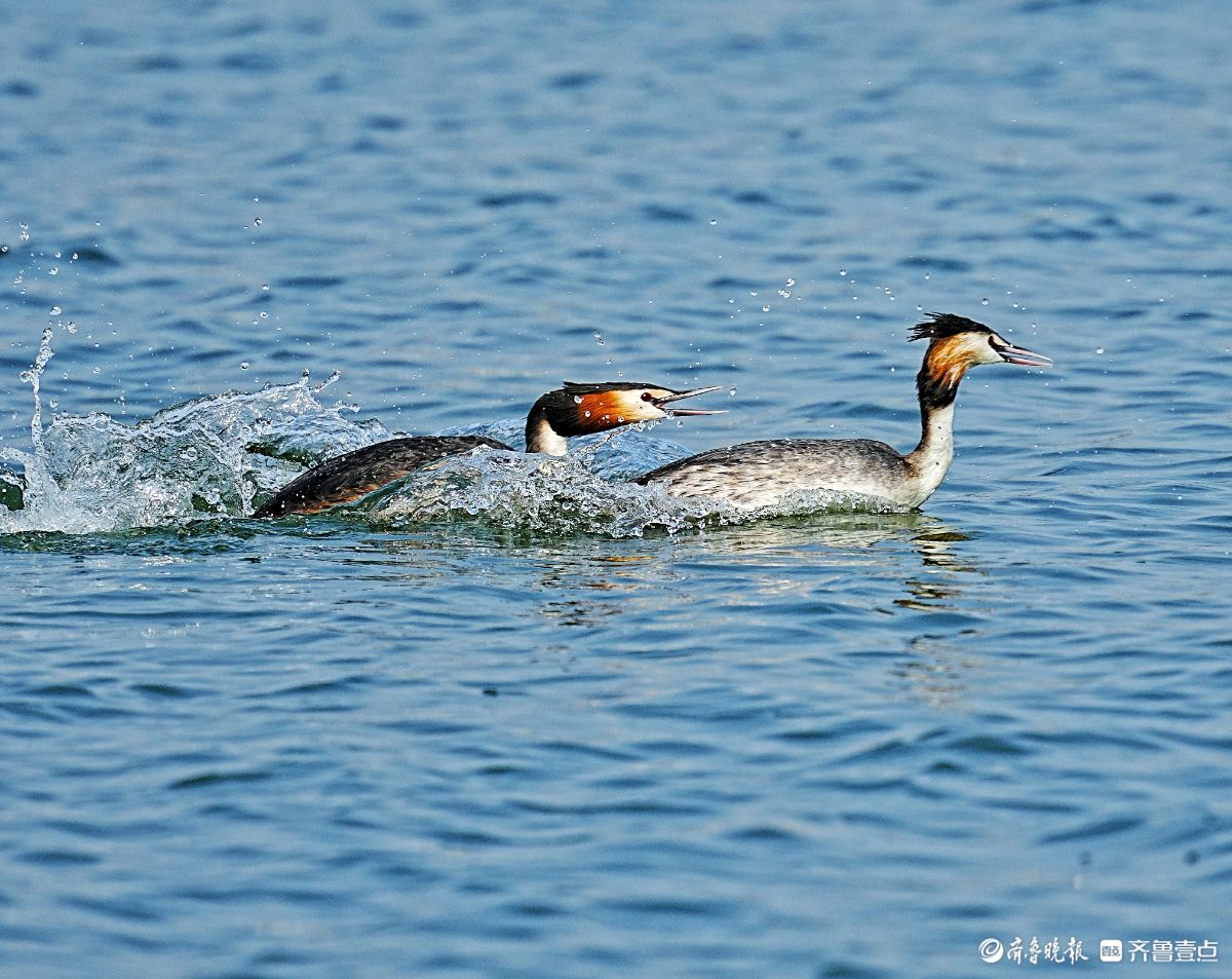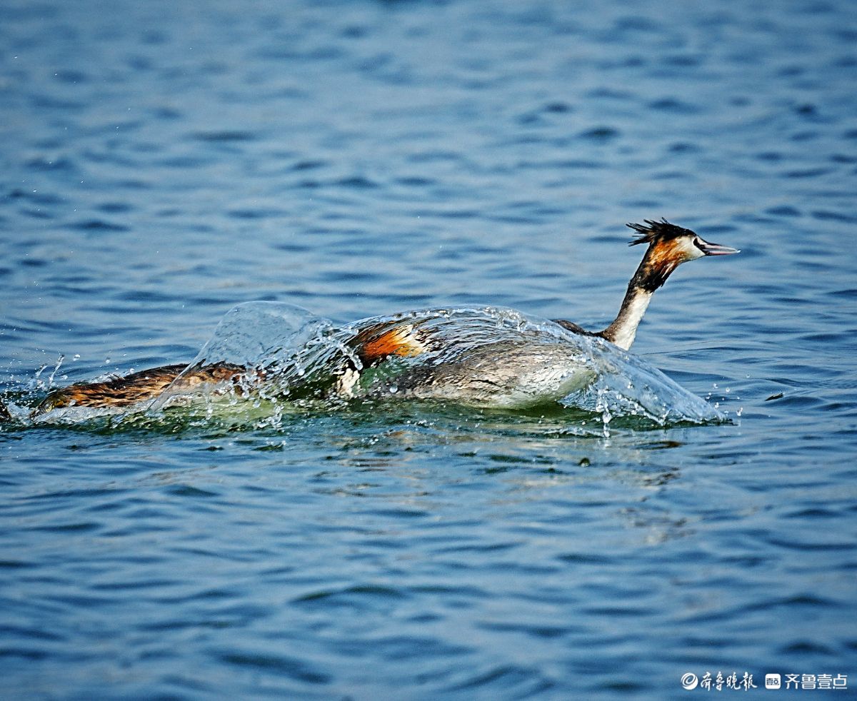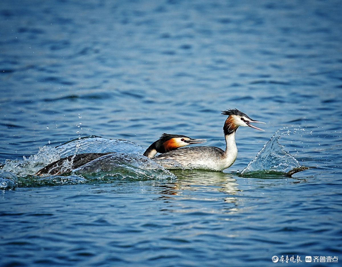 华山湖公园,追逐抢食的凤头䴙鹈