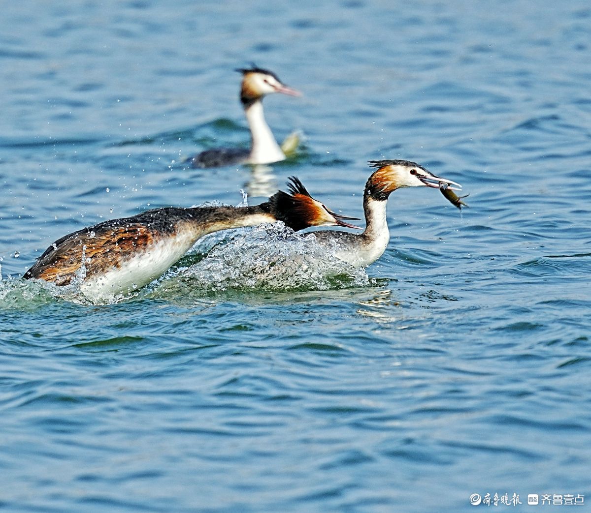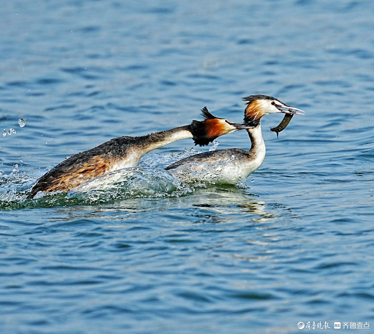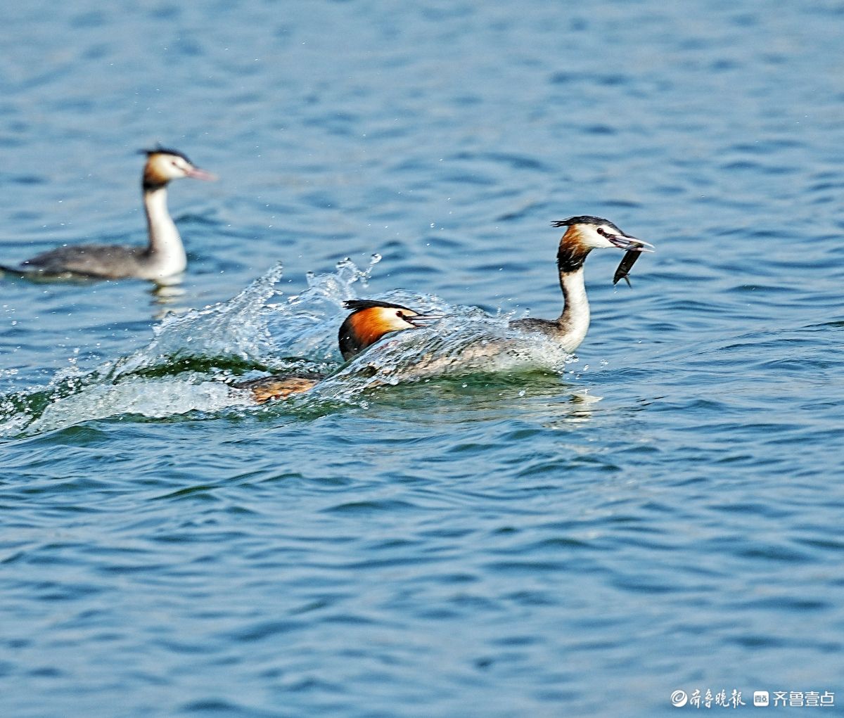 华山湖公园,追逐抢食的凤头䴙鹈