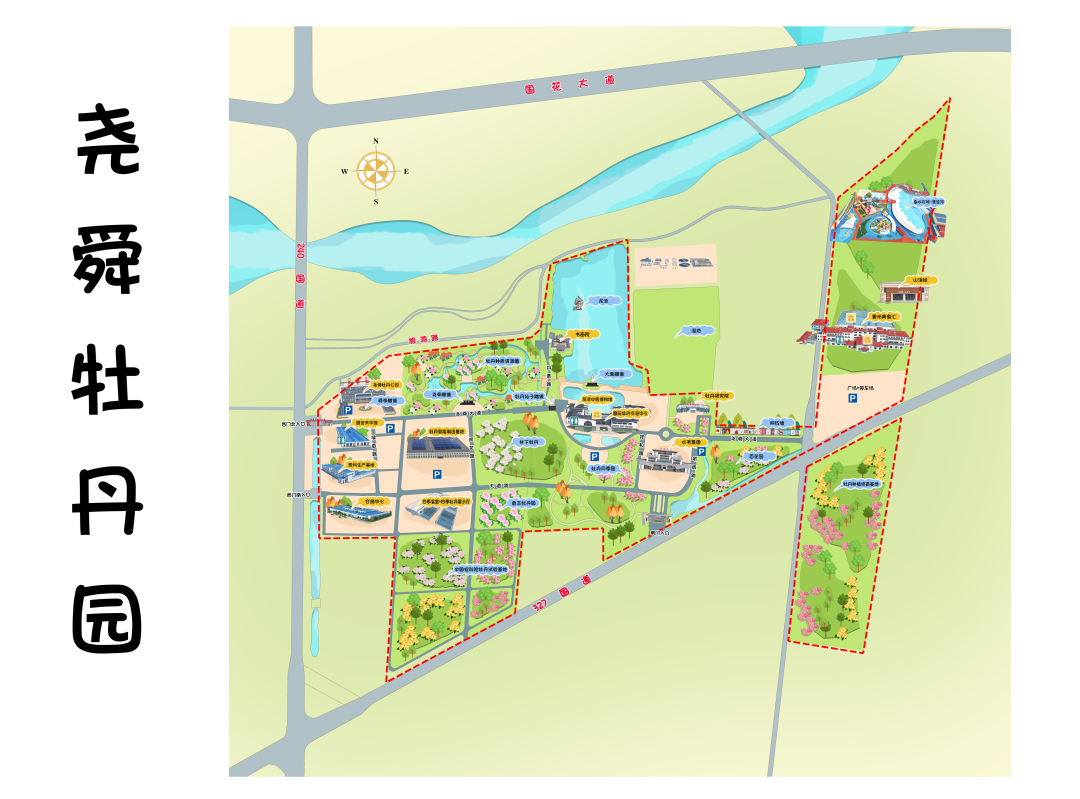 菏泽尧舜牡丹园占地1000余亩,集牡丹观赏、科研智造、文化旅游、休闲娱乐等功能于一体,是国家3A级旅游景区、山东省工业旅游示范点。