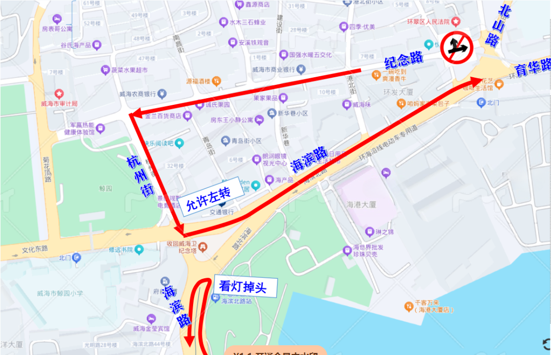 调整后,早晚高峰期间,纪念路进入育华路的车辆,可通过杭州街-文化路路口左转后经海滨路进入育华路。