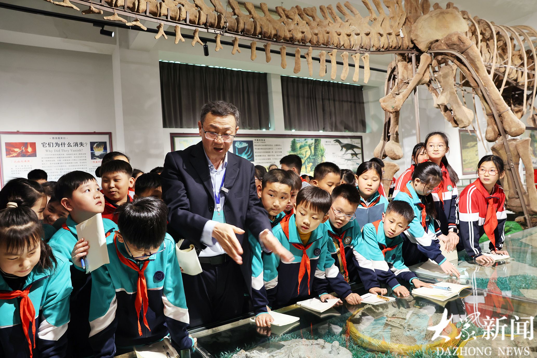 在现场互动问答环节,小学生们踊跃提问,涉及古生物习性、化石挖掘保护、AI复原古生物等话题。
