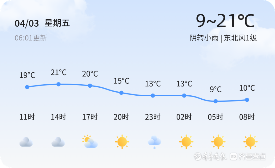 今天是4月3日,星期五,农历二月十六。枣庄市今天天气阴转小雨,气温9℃至21℃,东北风1级,空气湿度69%,PM2.5指数为110,属于中度污染,空气质量状况一般。市民在外出时建议携带雨具,注意保暖,尤其是老人和小孩,同时敏感人群应尽量减少外出,做好防护措施。