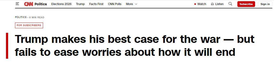 美国有线电视新闻网评论:特朗普竭力为这场战争辩护,却未能消除人们对战事走向的担忧。
