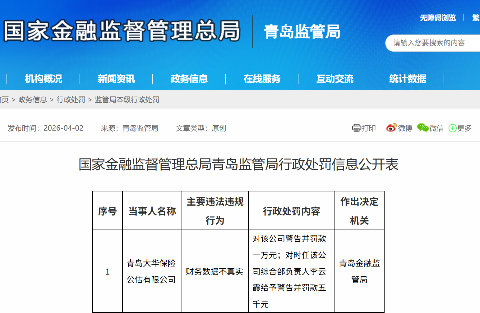 4月2日,国家金融监督管理总局青岛监管局行政处罚信息公开表显示,青岛大华保险公估有限公司(下称“青岛大华”),因财务数据不真实,被处以警告并罚款一万元;同时对时任该公司综合部负责人李云霞给予警告并罚款五千元。