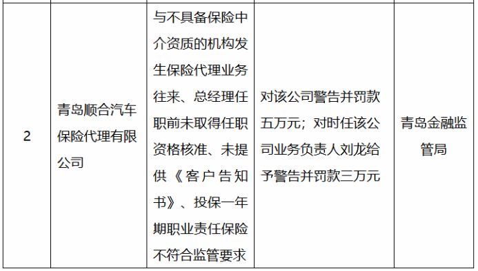 4月2日,国家金融监督管理总局青岛监管局官网公示的行政处罚决定书显示,青岛顺合汽车保险代理有限公司因与不具备保险中介资质的机构发生保险代理业务往来、总经理任职前未取得任职资格核准、未提供《客户告知书》、投保一年期职业责任保险不符合监管要求被警告并罚款5万元。同时,时任该公司业务负责人刘龙被警告并罚款3万元。