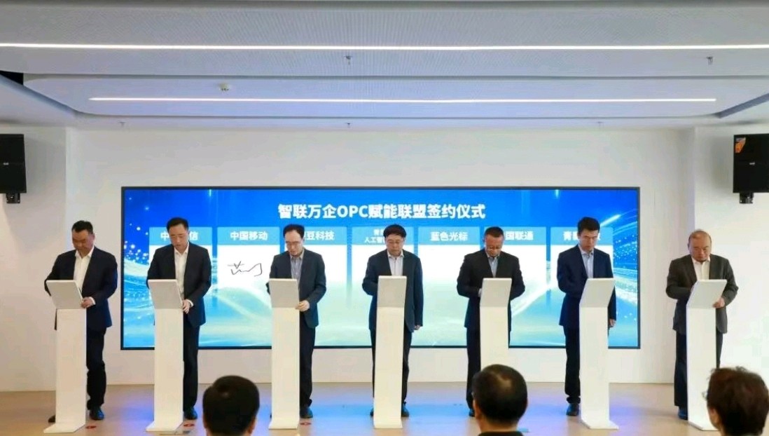 活动现场,青岛市人工智能协会、檬豆科技、蓝色光标、青岛移动、青岛联通、青岛电信、青影生数共同完成“智联万企OPC赋能联盟”签约仪式,携手推动市北区OPC生态建设迈入多方协同、聚力赋能的全新阶段。