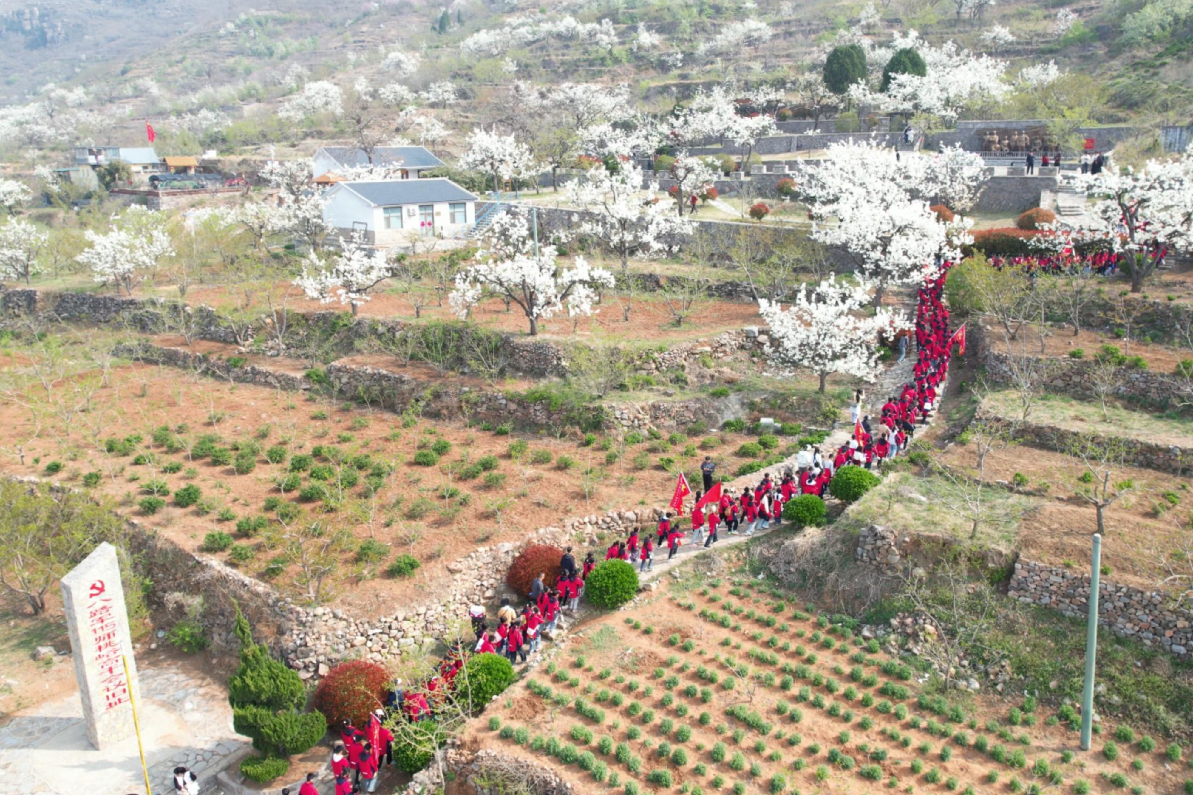 三月末的桃峪村,梨花正盛。清晨的山脚,天气微凉。学生们面对往返近十公里的路途,眼神坚定,一路上高唱着歌曲,相互鼓劲加油,汗流浃背仍不掉队。许多家长自发加入队伍,和师生们一起向山间进发,与山间的梨花交相呼应。