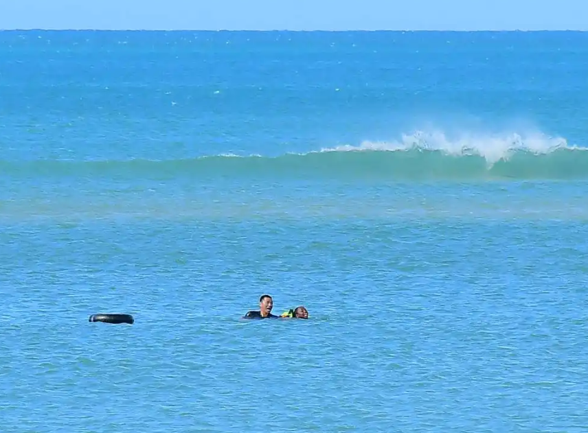 6月15日,在坦桑尼亚达累斯萨拉姆市海边,张军桥(左)营救溺水的当地女子。图源:新华社
