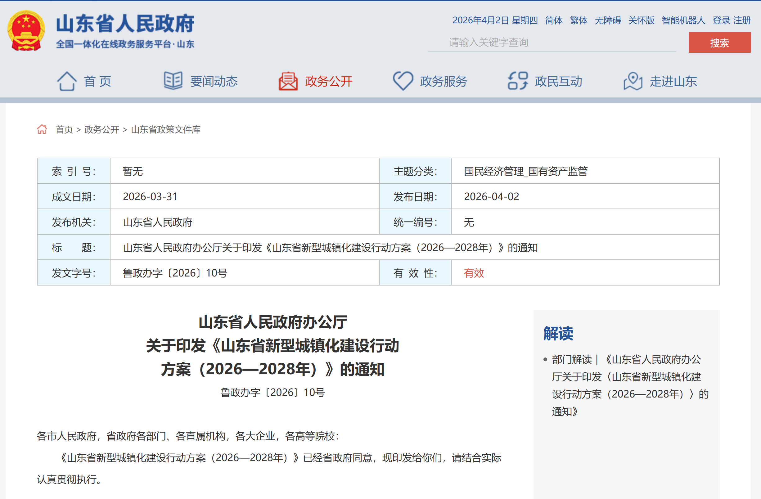 4月2日,山东省政府网站发布《山东省新型城镇化建设行动方案(2026—2028年)》(以下简称《行动方案》)。