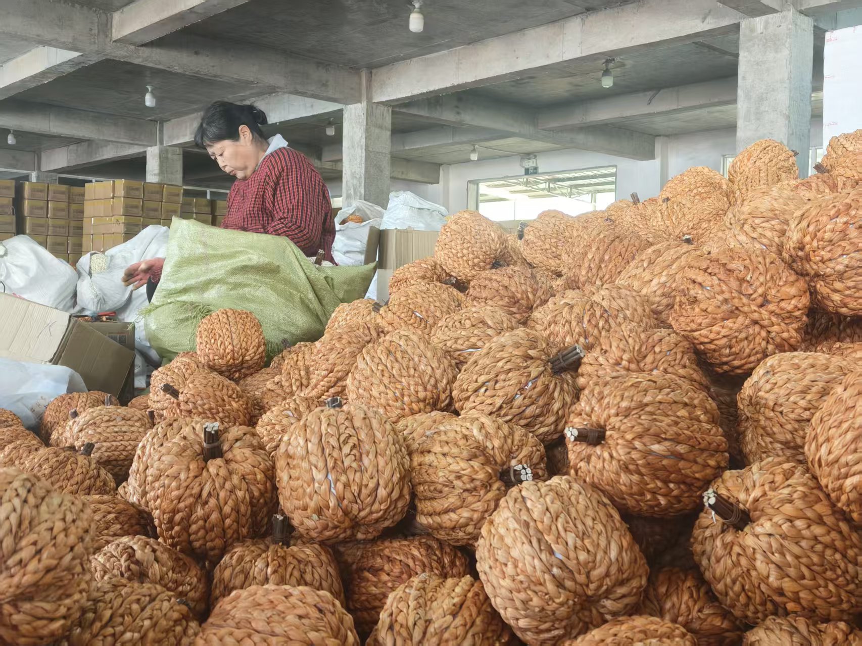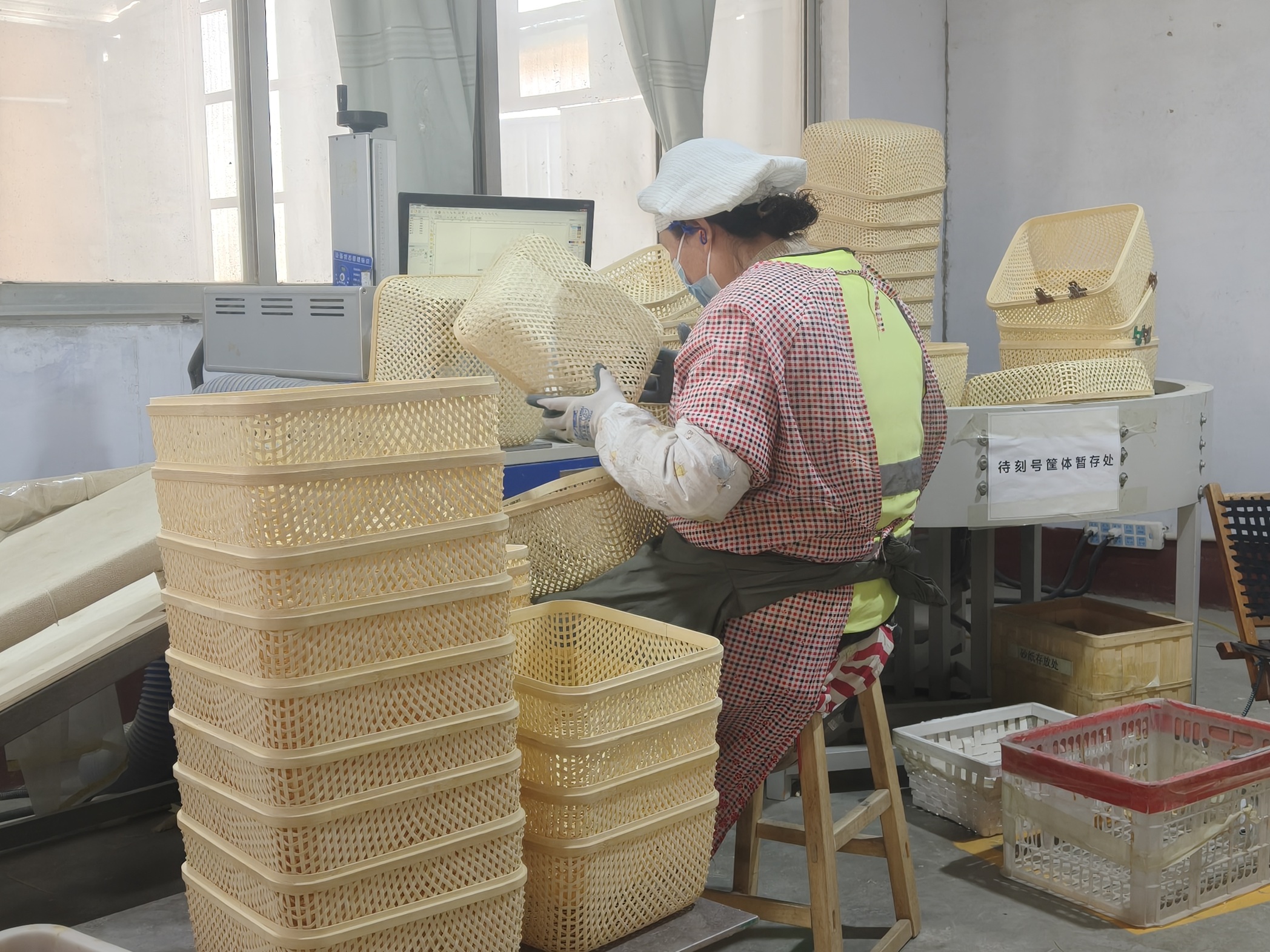 连兴工艺的车间里,工人正在检查加工户供应的柳编工艺品。都亚男摄