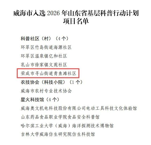 近日,威海市科协印发《关于公布2026年山东省基层科普行动计划入选项目名单的通知》,荣成市科协推荐的寻山街道青鱼滩社区入选2026年山东省基层科普行动计划“科普社区(村)”项目名单。