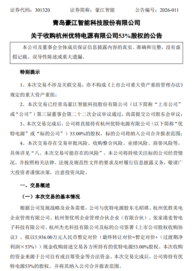 4月2日晚,豪江智能(301320.SZ)公告称,公司拟以支付现金方式收购毛昭祺、杭州优胜美电企业管理有限公司、杭州智优明企业管理合伙企业(有限合伙)等5名交易对方合计持有的杭州优特电源有限公司(下称“优特电源”)53%股权,本次交易暂定对价为5936万元。交易完成后,优特电源将成为公司的控股子公司,并纳入合并报表范围。