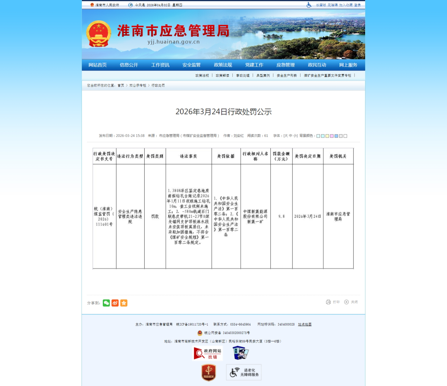 对此,处罚机关依据《中华人民共和国安全生产法》相关规定,对其罚款人民币9.8万元。行政处罚决定书文号:皖﹝淮南﹞煤监管罚﹝2026﹞111601号。