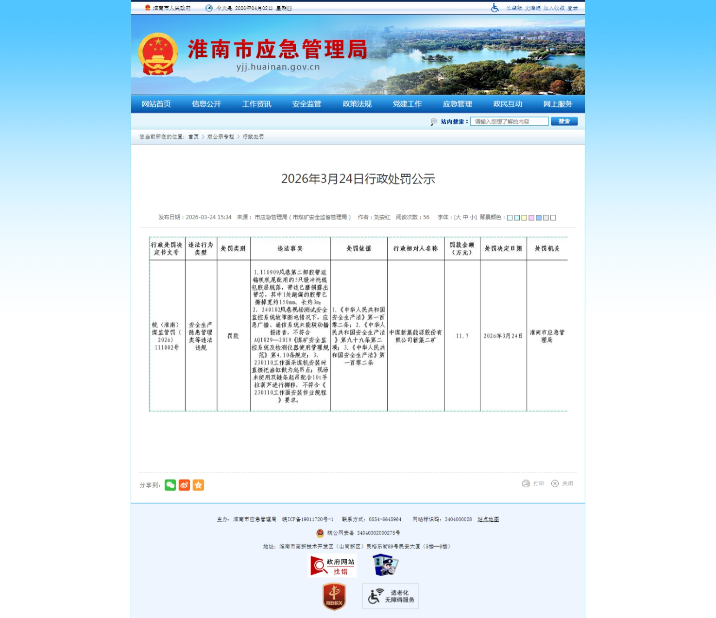 对此,处罚机关依据《中华人民共和国安全生产法》相关规定,对其罚款人民币11.7万元。行政处罚决定书文号:皖﹝淮南﹞煤监管罚﹝2026﹞111002号。