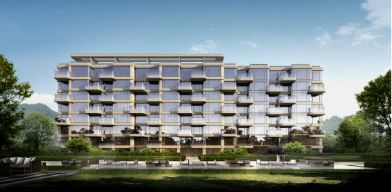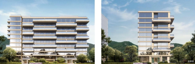 立面材质:为融合自然环境,打造人与自然共生的立面美学,项目在立面打造上,采用玻璃幕墙+大面积铝板,玻璃幕墙配置宽幕超白玻璃,通过简约的线条设计,最大化保证观景面,实现“户户观山”的居住体验。